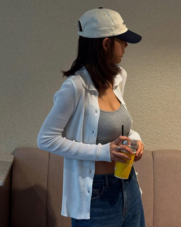 김준희 님은 네이비와 아이보리가 배색된 야구 모자를 선택해 전체 룩에 포인트를 줬고, 화이트 스니커즈와 함께 스포티한 무드를 더했어요.