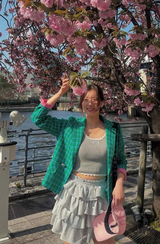 밝은 회색 톤의 미니 스커트는 계절감에 맞는 경쾌함을 한껏 살려줍니다. 무엇보다 러플 디테일이 자연스럽게 퍼지며 걸을 때마다 생동감을 주는 점이 포인트였어요. 겹겹이 층진 프릴이 움직임에 따라 살아나면서 소녀스러운 느낌까지 더해주죠. 봄 데이트룩으로 이보다 완벽할 수 있을까요?